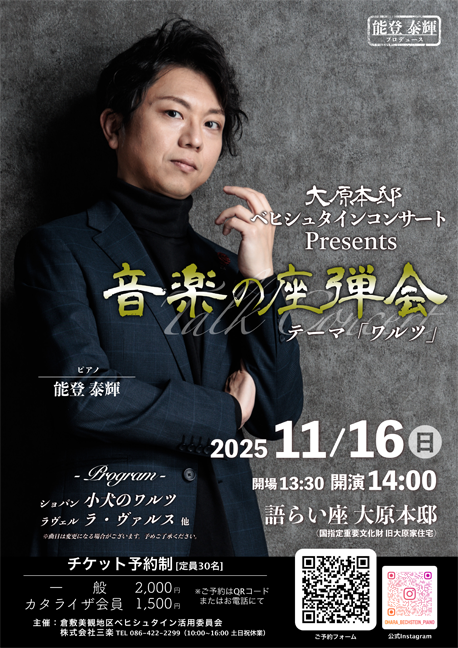 お知らせ 2025-10-14 コンサート 11月16日 大原本邸ベヒシュタインコンサートpresents「音楽の座弾会」 大原家で代々愛され受け継がれてきた、世界三大ピアノブランドのひとつ「ベヒシュタイン」のピアノ(1928年ドイツ製)の音色を、ピアニスト能登泰輝さんの演奏とお話でお楽しみいただく音楽の座弾会。今回から新たに試みによる、演奏会でもない、勉強会でもない音楽家とお客様がクラシック音楽の本質を深く追求する「音楽の座弾会」を開催いたします。毎回テーマを決めて色々な角度から音楽を楽しんで頂けたらと思っております。今回のテーマは「ワルツ」です。能登さんの解説と演奏でお楽しみください。音楽の座弾会ご希望の方は、お電話にて事前予約を承ります。皆様のご来場をお待ちしております。*世界三大ピアノブランドのひとつ「ベヒシュタイン」の1928年ドイツ製アップライトピアノ。クラウドファンディングによるご支援で2022年に修復し、「語らい座大原本邸」に常設しています。 ■日時2025年11月16日(土)13時30分開場/14時開演■定員30名〔事前予約受付〕※申込先着順で、定員になり次第締め切りとさせていただきます。■料金一般 2,000円カタライザ会員 1,500円■お申し込み【予約フォーム】下記QRコードからお申し込みいただけます。→フォームでの予約受付は終了いたしました。残り僅かでございます。お電話にてお問い合わせください。 【電話】086-422-2299株式会社 三楽(10:00~16:00/土・日・祝日は休業)■出演能登 泰輝(のと たいき)ピアノ2025年11月16日チラシ 一覧へもどる