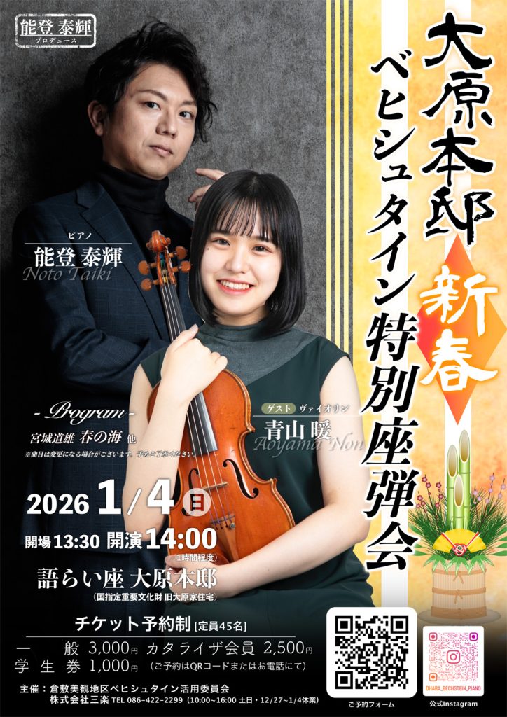 お知らせ 2025-12-22 コンサート 1月4日公演「大原本邸 新春 ベヒシュタイン特別座弾会」 大原家で代々愛され受け継がれてきた、世界三大ピアノブランドのひとつ「ベヒシュタイン」のピアノ(1928年ドイツ製)の音色を、ピアニスト能登泰輝さんの演奏とお話でお楽しみいただく音楽の座弾会。今回は新春ということもあり、ニューイヤーコンサートと座弾会の融合でお届けします。ゲストにお迎えするのは、前回に引き続きご出演いただきますヴァイオリニストの青山暖さんです。新春らしい「春の海」から、皆さまがよく耳にするおなじみの演奏でお楽しみください。特別座弾会ご希望の方は、下記QRコードから、またはお電話にて事前予約を承ります。皆様のご来場をお待ちしております。*世界三大ピアノブランドのひとつ「ベヒシュタイン」の1928年ドイツ製アップライトピアノ。クラウドファンディングによるご支援で2022年に修復し、「語らい座大原本邸」に常設しています。 ■日時2026年1月4日(日)13時30分開場/14時開演〔約1時間程度〕■定員45名〔事前予約受付〕※申込先着順で、定員になり次第締め切りとさせていただきます。■料金一般 3,000円カタライザ会員 2,500円学生券 1,000円■お申し込み【予約フォーム】下記QRコードからお申し込みいただけます。 【電話】086-422-2299株式会社 三楽(10:00~16:00/土・日・祝日は休業)■出演能登 泰輝(のと たいき)ピアノ青山 暖(あおやま のん)ヴァイオリン 一覧へもどる
